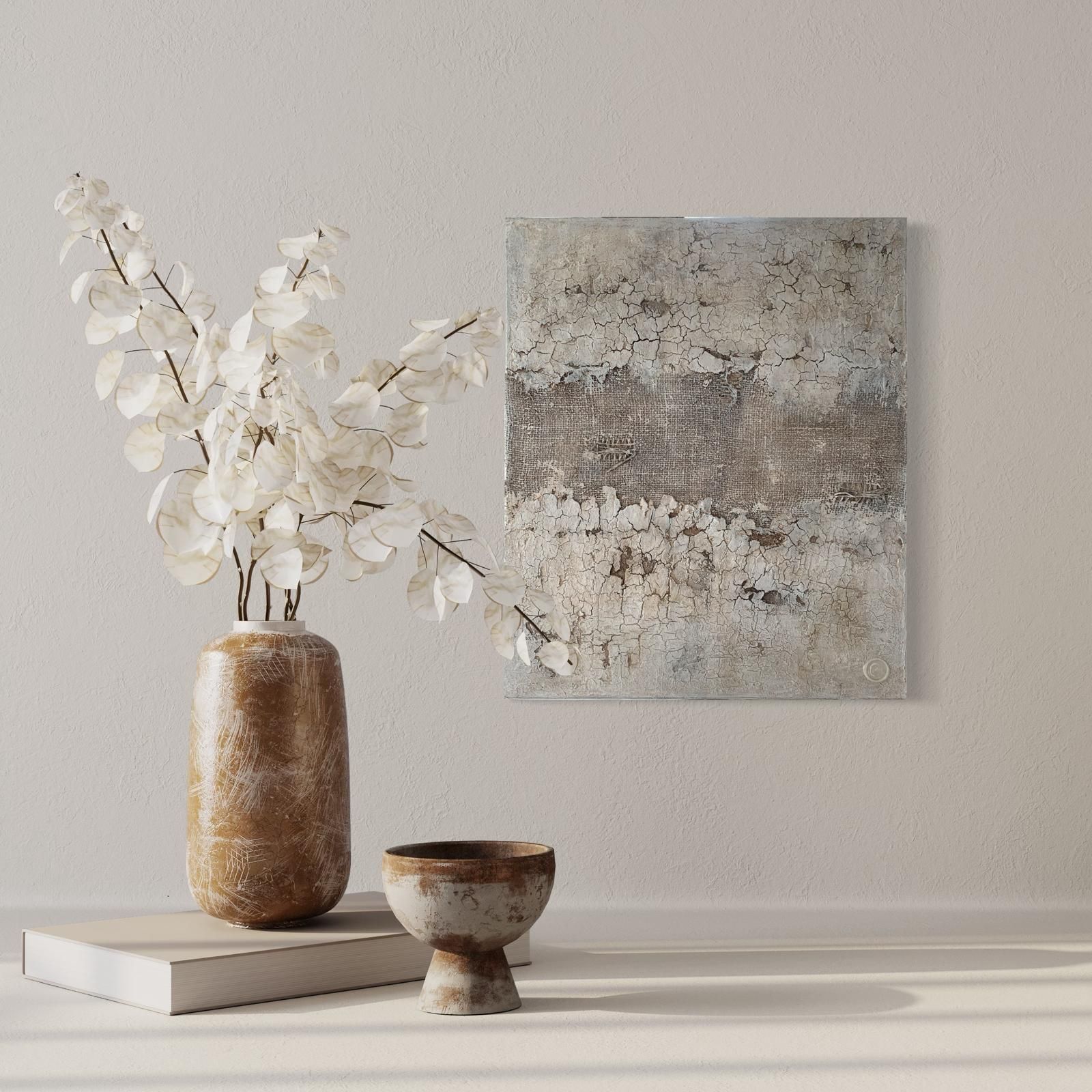 Le temps passe comme un fou et pourtant j'essaie d'arrêter l'horloge pendant un moment, de l'appeler ainsi : échapper au temps et à la ruée de la vie quotidienne. Et c'est justement à ce moment-là que j'ai redécouvert ma passion pour la peinture. Mon niveau de stress diminue tandis que mes mains glissent sur la toile. La merveilleuse sensation de laisser tout se passer dans le flux du moment. J'essaie de ramener cette détente dans mes œuvres : des couleurs calmes, des mouvements doux et des formes abstraites.